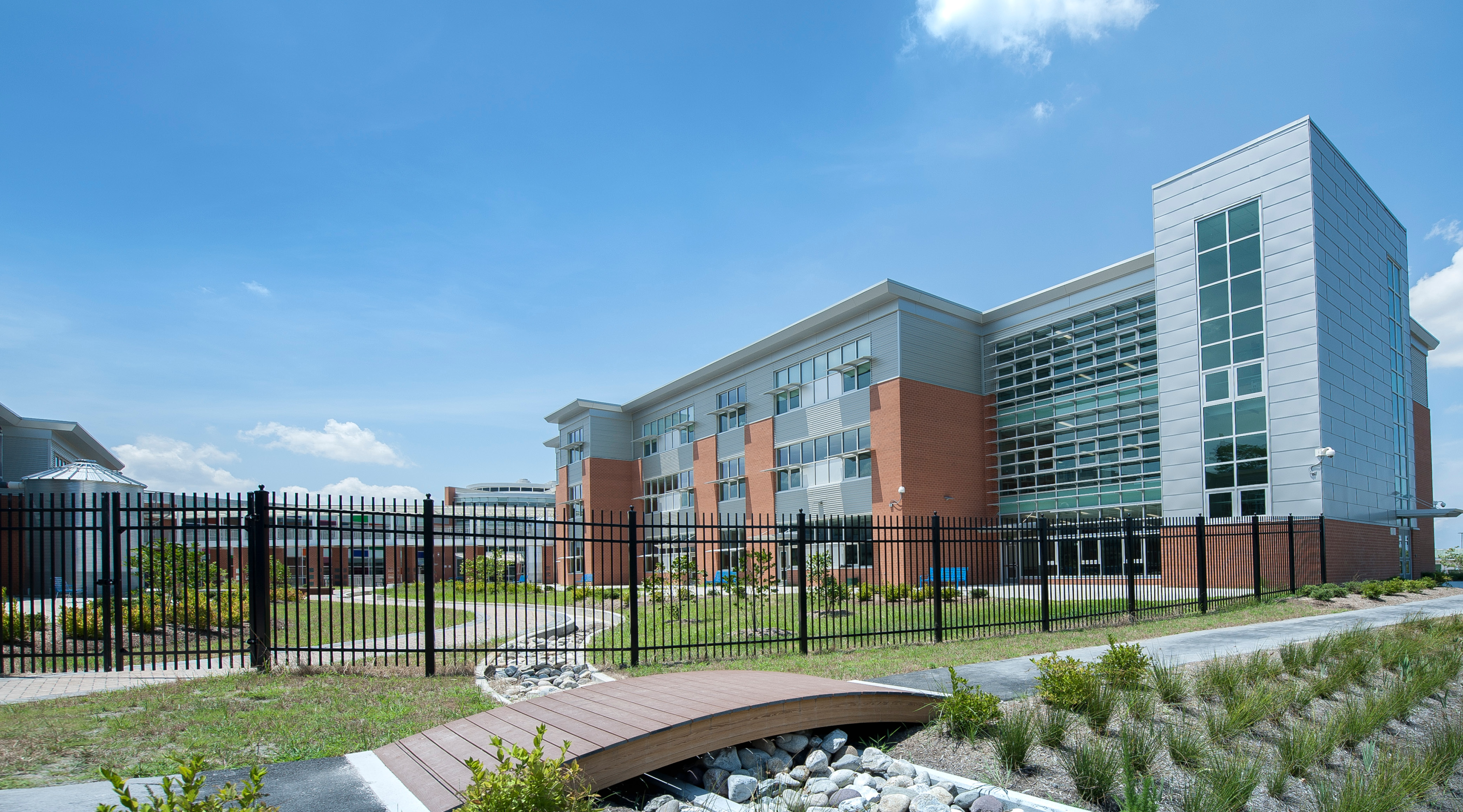 The former Old Donation Center and Kemps Landing Magnet schools were combined into a single consolidated 225,785 square foot facility to provide gifted and talented services for grades 2-8 as well as a Category II Emergency Shelter. The new school for Virginia Beach City Public Schools is a 1,375-student school that features a central core of common facilities and two academic wings: a three-story middle school wing and a two-story elementary wing. The facility includes an auditorium, black-box theater, a mixed-use lecture hall, library, dance studios, and rooms for music and visual arts. The building is sited on the former Old Donation Center site which was demolished summer of 2014 in order to begin construction. Old Donation Center and Kemps Landing Magnet School temporarily moved into the former Princess Anne Middle School, where they stayed for 2 1/2 years until the construction of their new building was complete in April 2017. Construction documents for this new facility were entirely produced using Revit® Building Information Management (BIM) software. Targeted for LEED Silver certification. Budget was $63,615,000.