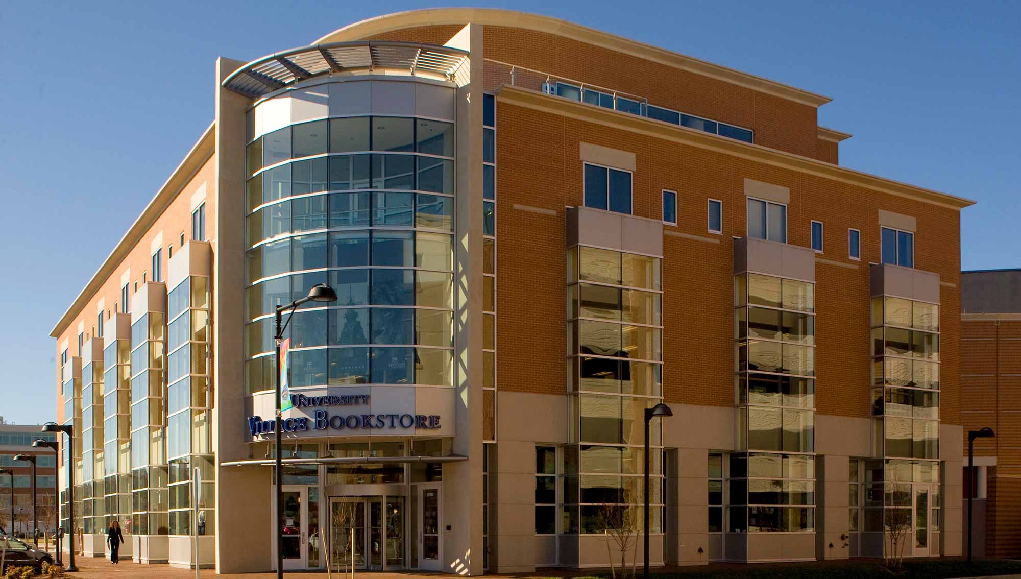 The first and second floors are home to the new Old Dominion University Bookstore, with part of the space catering to textbooks, clothing, school memorabilia, and student supplies, while the remainder of the space sells books, magazines, and multimedia geared toward the public. Interior spaces include a two-story atrium, lounge area, and a coffee house with outdoor seating. The third and fourth floors are accessible by a separate entrance and include bookstore support spaces and ODU offices. A fourth-floor rooftop terrace offers views over the University Village.